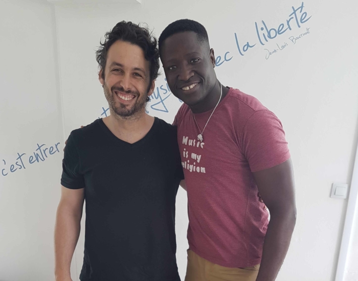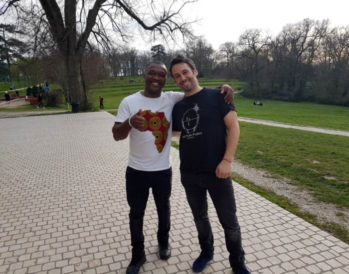 Une petite pause avec le percussionniste ivoirien, Thomas Gueï, à Cenon, en 2019.